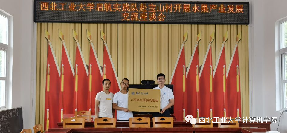 最后,实践队在村委会举行了“西北工业大学社会实践基地”挂牌仪式。实践基地的建立,不仅为宝山村提供智力支撑,加强宣传和扩大影响搭建了新的平台,同时,也为西工大学生利用好宝山村产品资源优势,深入一线,深入实践提供了新的载体。