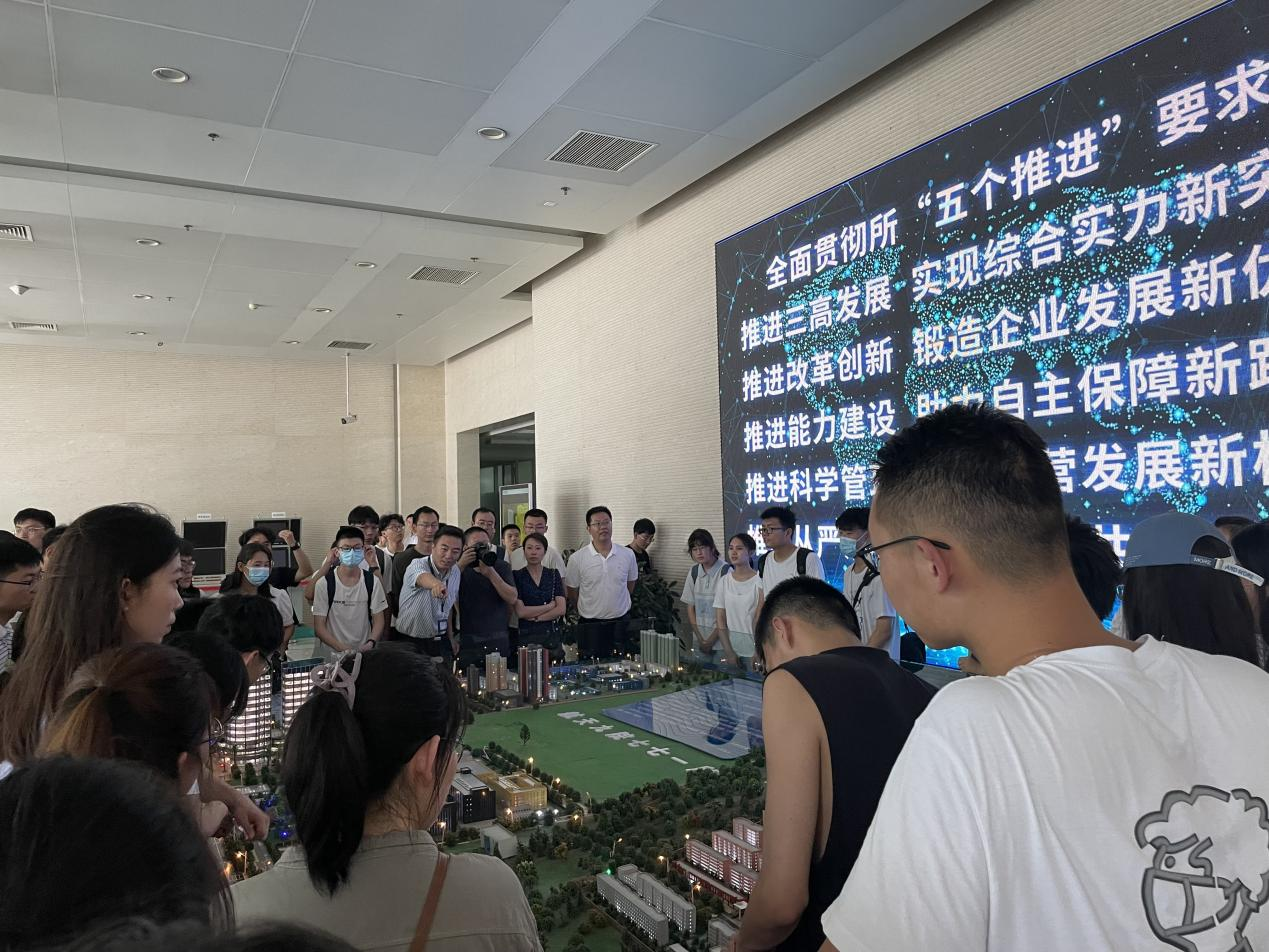 之后同学们观看研究所沙盘,了解其交通道路、地理环境等相关信息,并参观了七七一所特种计算机设计事业部、混合集成电路精密生产车间、特种电源事业部。