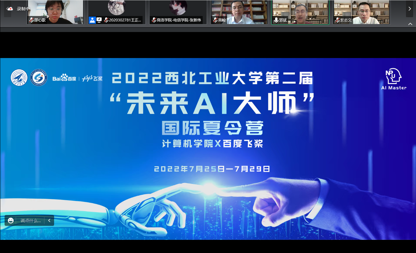 宣传片,全面了解了西工大计算机的学科特色、师资力量、人才培养、科学研究和发展愿景。接着,观看了2021首届西工大“未来AI大师”国际夏令营的VCR,一起回顾首届夏令营的精彩瞬间。