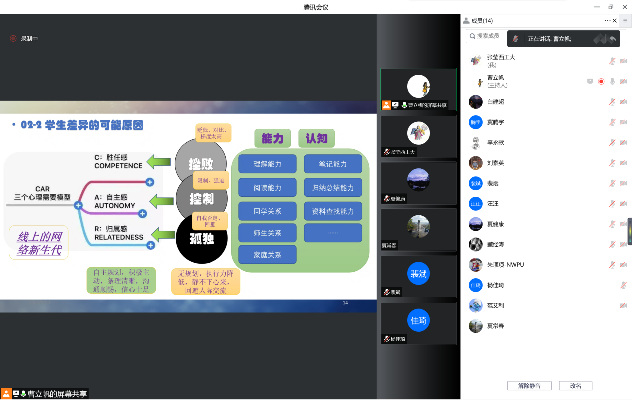 王云岚副教授从为师之道、学业规划、日常管理、风险管控等8个方面介绍班级管理心得,强调了因材施教、分类指导等细节管理的重要性。王云岚老师在分享中还提出,“管理好学生的最好时机是大一开学,其次是现在”,班主任老师应充分发挥自身专业优势,全面提升班级学生的专业素养及创新能力。紧接着,数学与统计学院裴斌教授作《全过程精准画像、全方位整合资源、全覆盖帮扶提升》专题分享。裴斌老师强调了坚持为党育人、为国育才的初心使命,介绍了“以学生为中心、润物细无声”的班级育人理念,提出了贯穿班级管理始终的“三航筑梦、促学笃行、强基固本、创新赋能、塑造价值”思想,