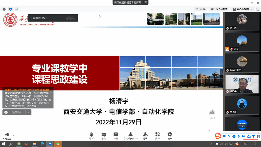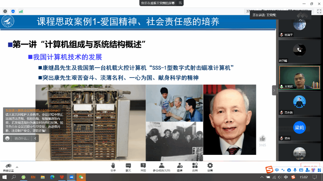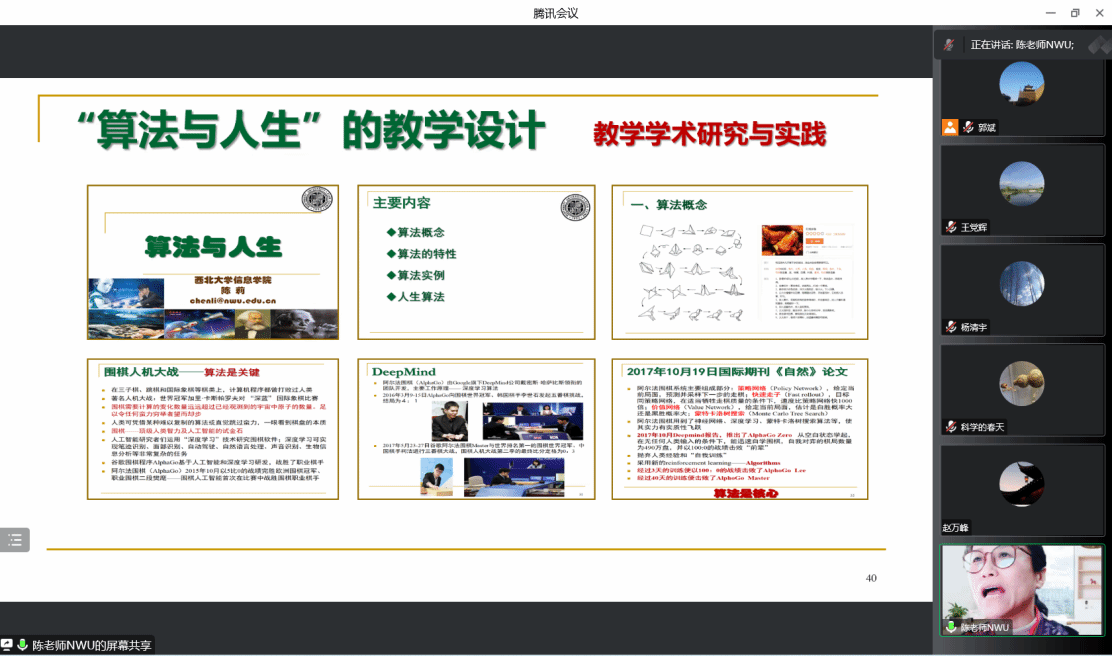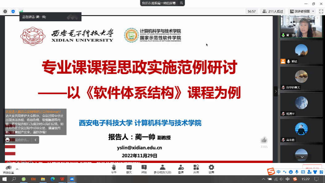 研讨会上,蒋宗礼教授首先作了特邀报告;接着,西北大学陈莉教授、西北工业大学王党辉副教授、西安电子科技大学蔺一帅副教授、西安交通大学杨清宇教授先后做交流报告,分别从人才培养目标、课程思政建设目标,课程思政教学设计,思政素材库建设等方面,讲解了各自在课程思政教学中的经验和成果。