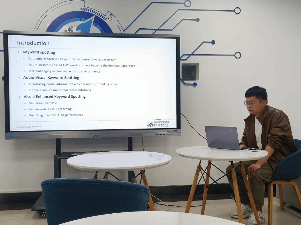 张奥分享了自己的ICASSP参会感受及对视听关键词检出论文做了简单介绍。在报告中,张奥详细地介绍了基于音频模态的关键词检出(KWS)系统在远场和有噪声干扰情况下性能下降的问题。为了解决这个问题,其团队提出了一种利用视觉信息提升性能的端到端关键词检出方法(VE-KWS)。该方法通过将视觉特征与音频特征相结合,提高了关键词检出的准确率。