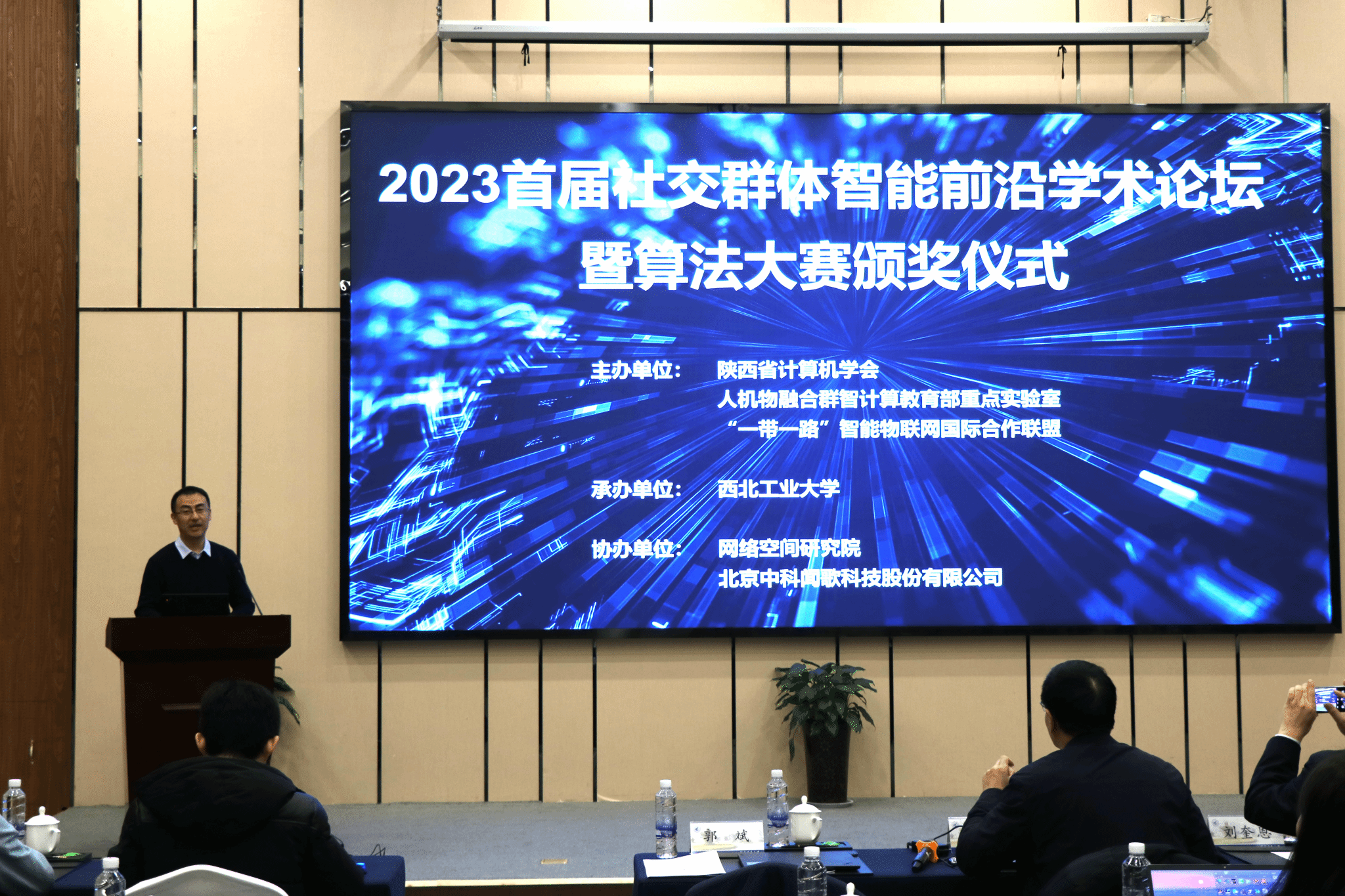 为推动群体智能的学术交流和应用推广,2023首届社交群体智能前沿学术论坛暨算法大赛颁奖仪式于12月28日在西北工业大学长安校区南山苑国际学术交流中心成功举办。本次论坛由陕西省计算机学会、人机物融合群智计算教育部重点实验室、“一带一路”智能物联网国际合作联盟主办,西北工业大学承办,网络空间研究院、北京中科闻歌科技股份有限公司协办。