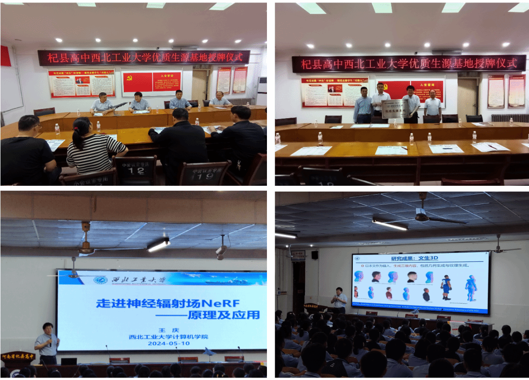 王庆教授和郗润平副教授前往河南杞县高级中学、开封求实中学、河南大学附属中学开展了形式多样的招生宣传工作。10日两位老师历经八个多小时行程到达杞县,受到杞县高级中学师生的热烈欢迎。两位老师与该校领导和重点班老师进行了座谈交流,开展了优质生源基地签约、授牌、送喜报等活动。王庆为学生们做了题为《走进神经辐射场NeRF——原理与应用》的前沿技术科普讲座,受到师生一致好评,报告结束后同学们围着王老师讨论交流,久久不愿离去,王庆老师鼓励同学们积极报考西北工业大学。