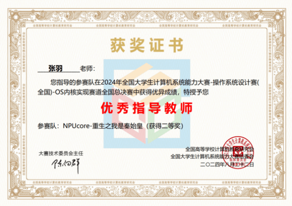 张羽教授带队的西工大“NPUcore”战队,获得全国大学生计算机系统能力大赛“操作系统设计”赛内核实现赛全国总决赛一等奖一项、二等奖两项、三等奖两项。西工大参赛队伍在国产龙芯LoongArch赛道中成绩尤为突出,一举包揽该赛道前三名!