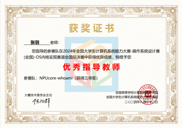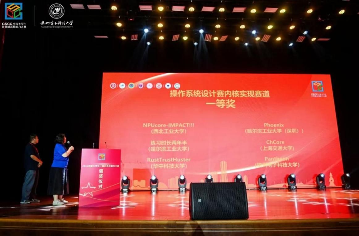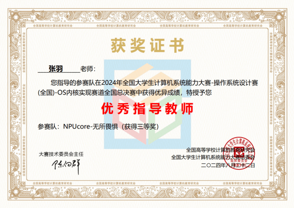 张羽教授带领的“NPUcore”战队从来自清华大学、北京大学、上海交通大学、哈尔滨工业大学、北京航空航天大学、华中科技大学等全国百余所高校209支入围总决赛的队伍中脱颖而出,获得了“操作系统设计”赛内核实现赛道(基于国产龙芯LoongArch硬件)全国总决赛一等奖1项(全国冠军)、二等奖2项(亚军和季军),一举包揽该赛道全国总决赛前三名。