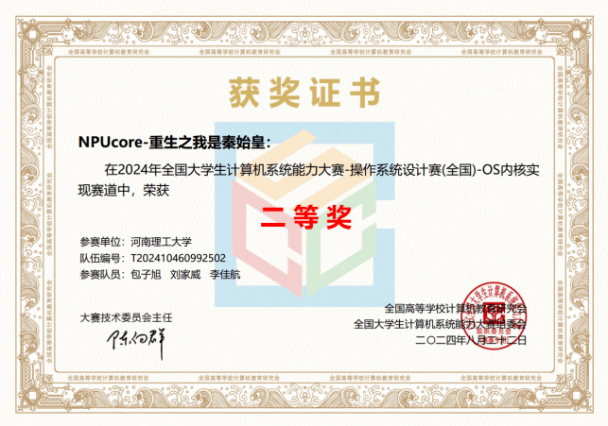 另外,“NPUcore”战队中还有来自哈尔滨理工大学刘鑫悦、西安理工大学李春同学,分获全国总决赛内核实现赛RISC-V赛道三等奖。