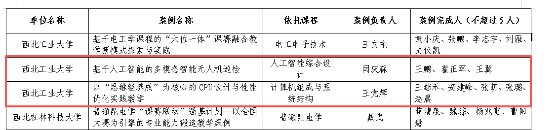 在课赛融合赛道获批2项,分别为《基于人工智能的多模态智能无人机巡检》和《以“思维链养成”为核心的CPU设计与性能优化实践教学》。
